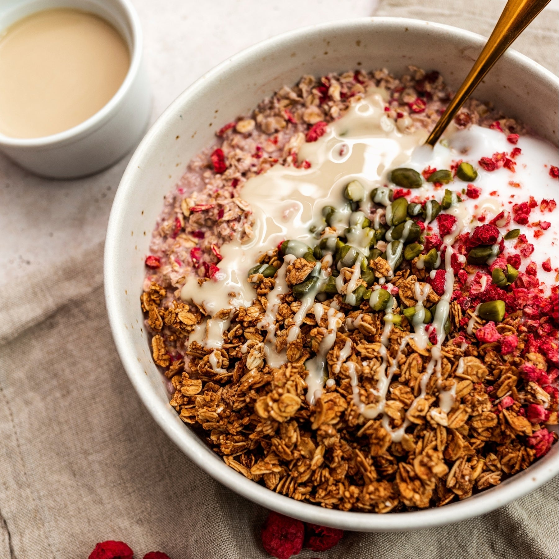 Granola ist eine knusprige Müsli-Mischung mit gerösteten Haferflocken als Basis. Es ist ein leckeres Frühstück oder Snack, welcher reich an Ballaststoffen. Granola wird häufig mit Joghurt, Milch oder Pflanzendrinks serviert und bietet einen leckeren Crunch und Süße.