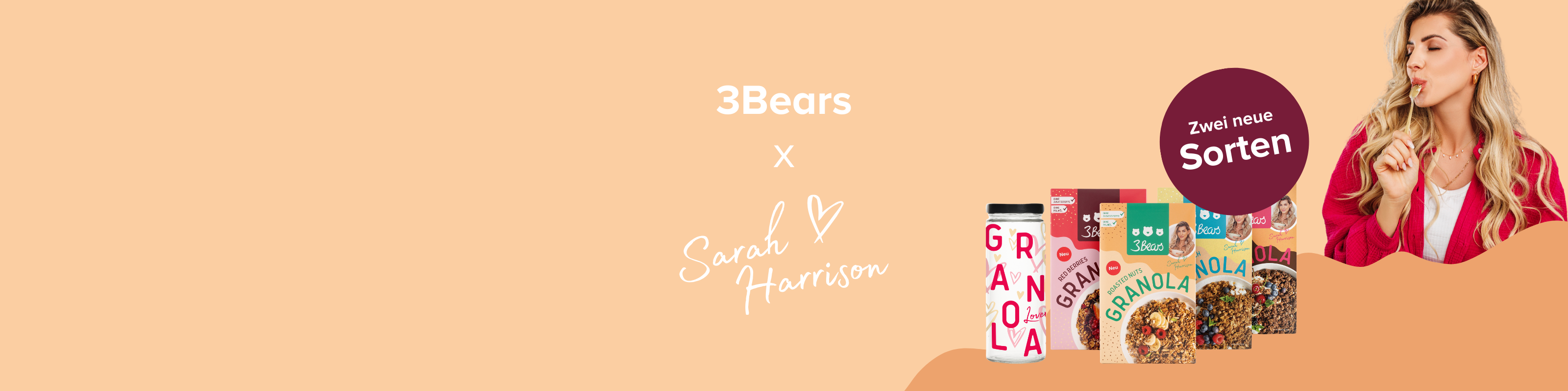 Das sagt Influencerin Sarah Harrison über ihr mit 3Bears entstandenes Granola: „Ich war ewig auf der Suche nach einem super leckeren, knusprigen Granola ohne Industriezucker. Leider ist es total schwer, so etwas zu finden. Deshalb bin ich besonders stolz, dass ich gemeinsam mit 3Bears zwei so fantastische Sorten entwickelt habe! Du wirst sehen, mein Granola schmeckt wie selbst gebacken und herrlich abwechslungsreich. Probier es doch mal mit Joghurt und frischen Früchten oder auch einfach pur aus der Packung!“